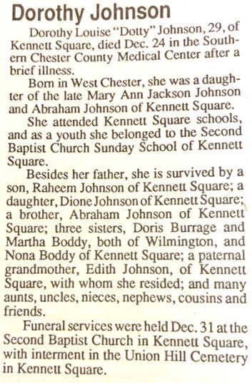 The obituary, shown below, was originally published in the Thursday, January 9, 1992, issue of The Kennett Paper (Kennett Square, PA).